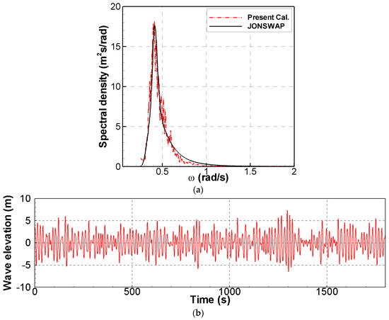 The non-linear physical phenomena of the 15-MW-class FOWT TLP were investigated under irregular waves. The target installation site for the 15-MW-class FOWT is near Ulsan, South Korea. The significant wave height and peak period for 50-year return periods at the target site are 11.8 m and 15.1 s, respectively. Springing and ringing phenomena can be difficult to evaluate in detail because strong green water phenomena can occur at high wave heights. To avoid these strong green water phenomena, in this study, the significant wave height was reduced by 60%, resulting in a significant wave height of 7.08 m. Additionally, for a CFD simulation, it is challenging to perform a long-term 3 h simulation at full scale. In this study, a 30 min CFD simulation was conducted, and the spectrum of the 30 min CFD simulation was matched to the JONSWAP spectrum. Figure 2 shows the spectra and time history of the irregular waves, and Table 2 summarizes the wave conditions.