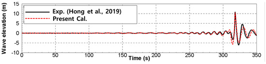 In the case of TLP, whipping can occur owing to the strong wave impact; therefore, the whipping simulation was performed under focused wave conditions. In this study, the focused wave in [22] was generated, which exhibited a maximum wave amplitude of 11 m and a peak wave frequency of 0.524 rad/s (12.0 s). In addition, only wave heading was considered as the head sea condition. Figure 3 shows snapshots of the generated wave, while Figure 4 shows the time histories of the experimental results in [22] and the simulation results of this study. As shown in Figure 3, the high wave approached the measuring point, and the wave was broken after passing the measuring point. In the whipping simulation, the TLP was placed at the measurement point. In addition, the numerical simulation results at the measurement point were in good agreement with the experimental results in [22], as shown in Figure 4.