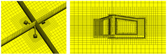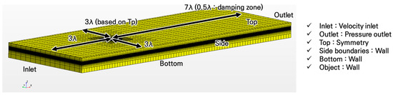 In this study, the focus was on the non-linear physical phenomena of the TLP alone; therefore, the 15-MW FOWT was excluded. However, the global inertia of the FOWT was considered in the numerical simulation, despite it being for a TLP simulation. Figure 5 illustrates the numerical grid system. Grid convergence tests were already conducted in [23], so the grid system in Figure 5 refers to [23]. The CFD software used was STAR-CCM+ 11.06V, and a full-scale simulation was conducted. A trimmed mesh type was used, and the number of meshes was approximately three million. To account for viscous effects, such as springing and ringing phenomena, seven prism layers were applied near the TLP, and a y+ value of 1000 was set. Two refinement zones were used for irregular wave generation, and the aspect ratio (dx/dz) of these zones was set to 5. The size of one of the refinement zones was 1.2 times the significant wave height, while that of the other was 2.4 times the significant wave height. Figure 6 shows the numerical domain size and boundary conditions. As shown in Figure 6, the numerical domain size was determined based on the wavelength of the wave peak period. The boundary conditions were as follows: the inlet boundary condition was a velocity inlet boundary condition; the outlet boundary condition was a pressure outlet boundary condition; the top boundary condition was a symmetry boundary condition; and the wall boundary conditions were applied to the bottom, object, and sides. Table 3 summarizes the numerical schemes. To capture the high-frequency non-linear physical phenomena, an adjustable time step was applied and the target CFL number was set to 0.5. Additionally, second-order upwind and second-order implicit schemes were applied to the discretization schemes of the convection and temporal terms, respectively. In this study, a laminar flow simulation was performed, with a focus on the platform motion and tendon tension characteristics.