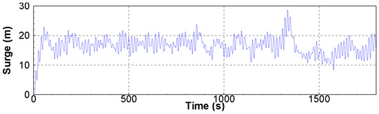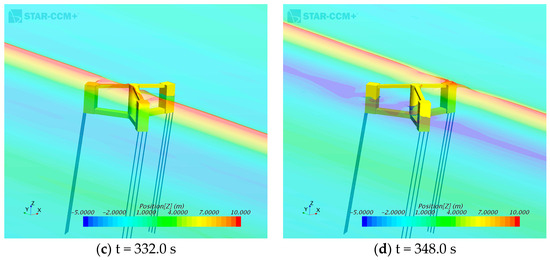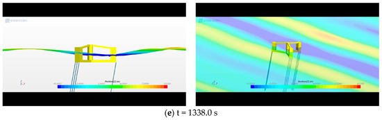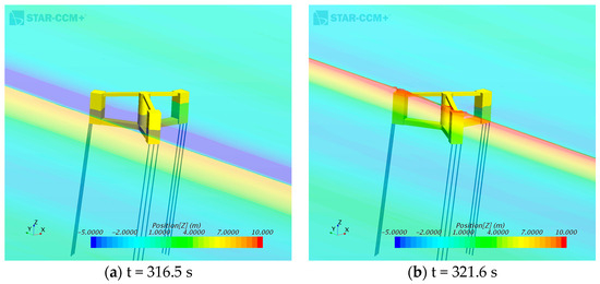 Figure 7 shows snapshots of the TLP motion under irregular waves. The time range was 1323–1338 s, and the maximum wave height occurred at approximately 1330 s, as shown in Figure 2b. As shown in Figure 7, the TLP exhibited a mean surge motion with a set-down. A strong wave impact occurred when the high wave approached the TLP. A weak green water phenomenon was observed on the deck of the TLP. A large surge motion of the TLP occurred when the wave re-impacted the back column of the TLP. After the wave passed over the TLP, a slight forward movement was observed.