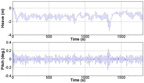 - In terms of the low-frequency motion, the surge–heave coupled motion occurred because of the set-down caused by the surge motion. In addition, the effect of the heave–pitch coupled motion was minimal under this wave condition.