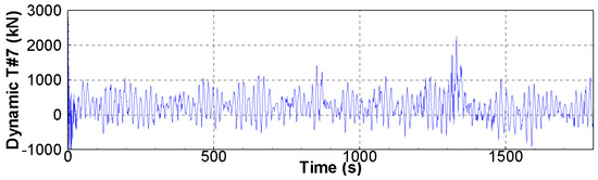Figure 10 shows the dynamic tension time histories of the TLP tendons. In the case of tendon #1, the dynamic tension was relatively smaller than that of tendons #4 and #7 due to the occurrence of the mean surge motion of the TLP. In this study, only the head sea condition was considered; therefore, the dynamic tensions of tendons #4 and #7 were identical. As shown in Figure 10, the dynamic tensions consist of components at both the wave frequency and high frequencies, with large dynamic tensions observed within the time window around 1320 s.
