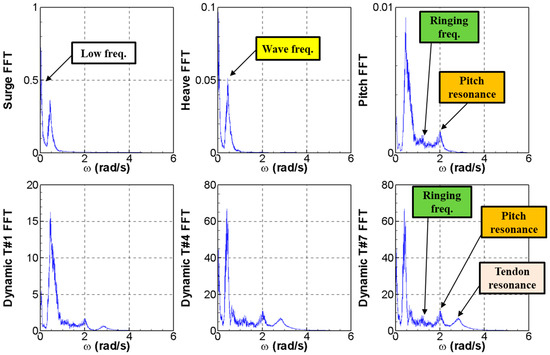 Figure 12 shows the FFT results for platform motions and dynamic tensions. As shown in Figure 2a, the wave energy is very small in the frequencies associated with the ringing and springing phenomena. Furthermore, it can be observed that the effect of heave–pitch coupled motion is very small in the FFT result for heave motion under this wave condition. The low-frequency response can be seen in the FFT results for the surge and heave motions. It can also be observed that surge and heave motions are coupled in the case of a TLP-type platform, as the low-frequency heave motion response occurs via surge motion. In the dynamic tensions of tendons #4 and #7 and in pitch motion, a ringing response was observed at approximately three times the wave frequency. Additionally, it is noticeable that tendon #1 was less sensitive to the ringing response due to its lower tension. Furthermore, the FFT results for dynamic tensions for all three tendons have their resonance frequencies. It is necessary to consider the tendon resonance frequency when a tendon stiffness is determined in the design stage. However, it can be found that the tendon resonance frequency has little effect on platform motion. The springing response caused by the wave sum frequency is noticeable in the FFT results for pitch motion and dynamic tensions.