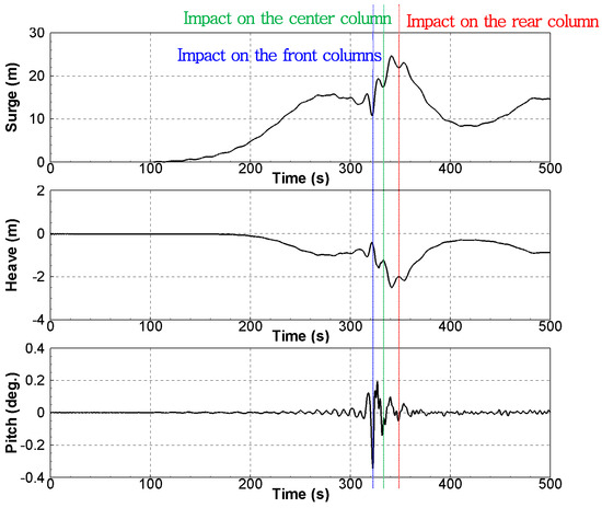 The TLP motion time histories are shown in Figure 14. As shown in the surge motion time history, a surge offset occurred with the green water phenomenon after the wave hit the front columns. The TLP moved slightly forward and the green water hit the center column. The largest surge offset occurred after the green water hit the center column. Finally, the green water hit the rear column. The magnitudes of the heave motion changed when the green water hit the columns in the following order: front, center, and rear columns. As shown in the pitch motion time history, as the wave impacts occurred sequentially, various frequencies occurred.
