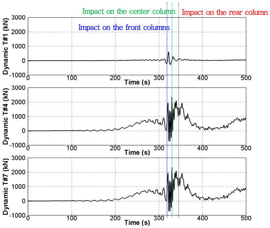 Figure 15 shows the dynamic tension time history for the tendons. Similar to the dynamic tensions of the TLP tendons under irregular waves, the dynamic tension of tendon #1 was the smallest. In addition, the dynamic tensions of tendons #4 and #7 were the same. Interestingly, large dynamic tensions occurred in tendons #4 and #7, such as impacts when green water hit the front and center columns. However, when the green water hit the rear column, no impact-like dynamic tension occurred in tendons #4 and #7. It is possible that some of the energy of the green water dissipated after the green water hit the center column. It can be observed that the largest dynamic tensions of tendons #4 and #7 occurred when the green water hit the center column, and the dynamic tensions of tendons #4 and #7 had various frequencies owing to green water impacts.