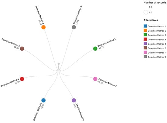 In Table 4, the present situation’s performance attribute matrix is shown. It can be used to assign a permanent weight to each attribute in the decision matrix. This weight reflects the relative importance of each attribute and is used to calculate the overall score for each detection method. The decision matrix (Table 2) assigns scores to each detection method for each attribute. Additionally, the scores reflect the performance of each method for a specific attribute. The permanent attribute matrix (Table 4) assigns permanent weights to each attribute in the decision matrix. These weights reflect the relative importance of each attribute and are used to calculate the overall score for each detection method.
