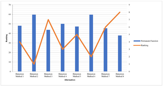 The permanent matrix and its value are produced for the ranking of the alternatives based on the normalized decision matrix calculated using (2) and (3), as well as the performance attribute matrix. Table 5 shows the calculated permanent matrix for Detection Method 1.
