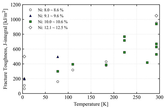 Materials usually experience changes in their inherent characteristics due to temperature change. Such changes can yield favorable outcomes from a design perspective. However, in several cases, limitations are imposed on the temperature range in which materials can be used. Hence, it is crucial to evaluate the suitability of materials at the design temperatures considering properties like yield strength, tensile strength, elongation, fracture toughness, fatigue characteristics, and coefficient of thermal expansion. For example, for austenitic stainless steels, the yield and tensile strength increase and the elongation decreases as the temperature decreases. Low-temperature embrittlement becomes one of the significant challenges faced at low temperatures. The identification and assessment of this phenomenon involve pinpointing the temperature at which a material’s ductility changes to brittleness. Figure 1 shows the fracture toughness of austenitic stainless steel as a function of temperature [23,24,25,26,27,28,29,30]. The selected 304, 304 L, and 316 L austenitic stainless steels have nickel contents ranging from 8.0 to 10.6%, and all were evaluated for fracture toughness by deriving the J-integral according to ASTM E1820. Although manufacturing and testing conditions varied, decreasing temperature and lower nickel content generally resulted in decreased fracture toughness.