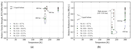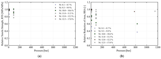 Effect of hydrogen pressure and nickel contents in terms of (a) relative tensile strength and (b) relative reduction in area from previous studies [38,41,74,75].