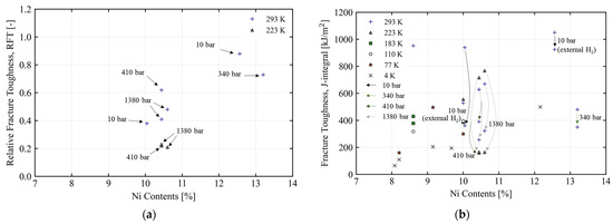 Effect of nickel content, temperature, and hydrogen condition on fracture toughness (a) in terms of relative fracture toughness and (b) in terms of fracture toughness from previous studies [13,14,15,16,17,18,19,20,91,101].