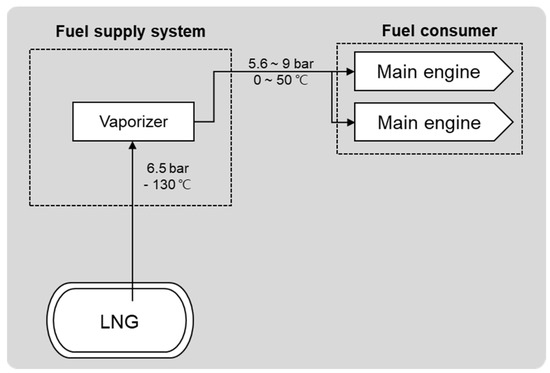 Figure 5 presents a schematic representation of the LNG-based low-pressure fuel supply system. In general, this system is composed of a fuel containment facility, a fuel supply system, and fuel consumption sources (e.g., internal combustion engines). LNG is stored at a temperature of −163 °C or below, and the design pressure may vary depending on the type of tank used. LNG is kept at a temperature of about −130 °C and a pressure of 6.5 bar while being fed to the vaporizer among the key components of the fuel supply system. Engines and boilers for propulsion and power generation are generally used as fuel consumers. The fuel supply system allows a gaseous fuel at 0–50 °C to be supplied at a pressure of 5.6–9 bar in a gaseous state to the fuel consumer in which it is consumed.