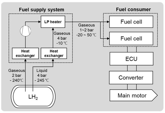 Figure 6 presents a schematic representation of the fuel supply system that is generally applied to hydrogen fuel cell-fueled ships based on liquid hydrogen. This system is composed of a liquid hydrogen tank, fuel supply system, and fuel consumer (e.g., fuel cells). Within each part of this system, hydrogen exists in various forms. Liquid hydrogen is stored in a tank at a temperature of −253 °C and fed to the fuel consumer via the fuel supply system. In general, the fuel supply system is composed of two heat exchangers, a compressor, and an LP heater. It is supplied to the heat exchangers in the state of either liquid or gas. From the liquid hydrogen tank, gaseous hydrogen is transported to one heat exchanger at −240 °C and 2 bar, while liquid hydrogen is transported to another heat exchanger at −245 °C and 4 bar. Afterward, the liquid hydrogen is converted into a gaseous form at the heat exchanger and then supplied to the LP heater while being kept at 4 bar and −10 °C. Finally, the liquid hydrogen is supplied by the LP heater to the fuel cell in a gaseous state at 1~2 bar and −20~50 °C. The fuel cell generates power by consuming the gaseous hydrogen to power the ship via the ECU, converter, and main propulsion motor.
