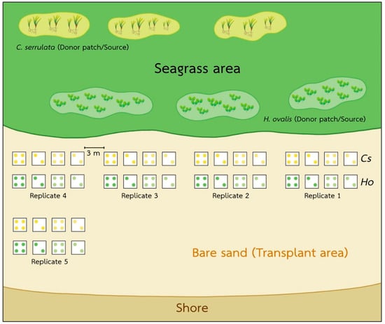 We conducted our investigation on the intertidal seagrass meadow at Kham Bay (7°30.414′ N, 99°18.406′ E), Trang Province, in the Andaman Sea, Thailand (Figure 1). In this area, two main seasons are monsoon dominated. The rainy season from May to October is dominated by the southwest monsoon, and the dry season from November to April is dominated by the northeast monsoon. This study site has been dominated by two seagrass species: Halophila ovalis and Cymodocea serrulata. However, the coverage of seagrasses in Trang province and Libong Island, which are the largest seagrass meadows in Thailand, have declined by 30% [26]. Coastal development and sedimentation from human activities were suggested as the main threats to seagrass meadows [27]. Then, the restoration and management activities in Trang province have been undertaken to enhance seagrass recovery and promote ecosystem services and biodiversity [28]. At Kham Bay, restoration was conducted in March 2021 by the Seaweed and Seagrass Research Unit (SSRU) team, Prince of Songkla University (PSU), to enhance the recovery of seagrass and compensate for seagrass habitat loss. This transplantation was attempted by using the plug method (15 cm PVC core), which is suitable in soft substrates with small and thin-leaved seagrass species. A 15 cm PVC core was used to extract the plants with the sediment, roots, and rhizomes intact from the donor site, and then, the shoots were extruded from the plug and buried in the sediment at the transplanted site. For the transplant meadow, two densities of each seagrass species, H. ovalis and C. serrulata in the planting unit (20% and 60%, respectively) and two conditions of planting unit (PU) densities/plot (2PU and 4PU) were deployed with five replicates of each condition. So, the number of PVCs implanted was 24 per replicate. Then, with five replicates, there were 120 PVCs in total. The initial transplanted area of each species was around 1.06 m2. The transplanted sites of these two species were close to each other, around 3–5 m apart, and were around 50–100 m away from the donor sites (Figure 2). All transplantation experiments were carried out on the intertidal flats with the same topography and had similar environmental conditions, such as water depth, wave current, sediment type, and light intensity. In this study site, light intensity was around 304–1090 μmol photons m−2 s−1, and the average temperature was 26–30 °C.