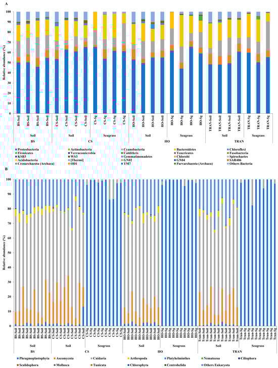 Relative abundances at the phylum level of (A) 16S rRNA and (B) 18S rRNA in four conditions and two sampling sources. BS = bare sand; CS = Cymodocea serrulata; HO = Halophila ovalis; TRAN = transplanted seagrass patch. Read counts were transformed to percent of relative abundance. For 16s rRNA, blue = Proteobacteria, orange = Actinobacteria, gray = Cyanobacteria, and yellow = Bacteroidetes. For 18s rRNA, blue = Phragmoplastophyta, orange = Ascomycota, gray = Cnidaria, and yellow = Arthropoda. The fewest are organisms detected at less than 1% relative abundance.