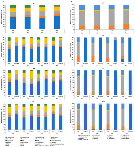 Relative abundances at the dominant phylum level of (A) 16S rRNA and (B) 18S rRNA of four conditions, two sampling sources, and four sampling times. BS = bare sand; CS = Cymodocea serrulata; HO = Halophila ovalis; TRAN = transplanted seagrass patch. Read counts were transformed to percent relative abundance. For 16s rRNA, blue = Proteobacteria, orange = Actinobacteria, gray = Cyanobacteria, and yellow = Bacteroidetes. For 18s rRNA, blue = Phragmoplastophyta, orange = Ascomycota, gray = Cnidaria, and yellow = Arthropoda. The fewest are organisms detected at less than 1% relative abundance.
