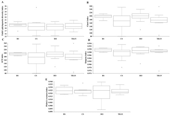 Species richness (A), species diversity (B–D), and species evenness (E) of 16S rRNA communities in four sites. BS = bare sand; CS = Cymodocea serrulata; HO = Halophila ovalis; TRAN = transplanted seagrass patch. Whiskers indicate the 10th and 90th percentiles.