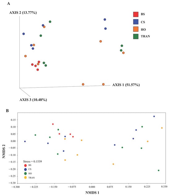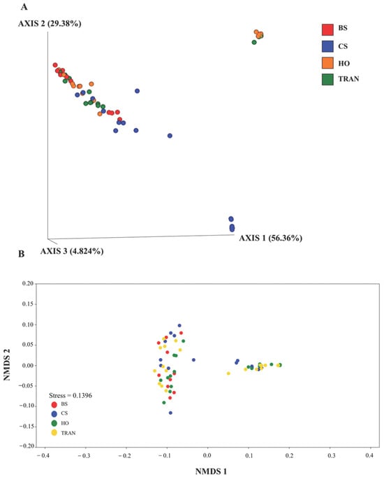 The PCoA (A) and nMDS (B) of 16S rRNA communities in four sites based on weighted UniFrac distance matrix and Bray–Curtis matrix. BS = bare sand; CS = Cymodocea serrulata; HO = Halophila ovalis; TRAN = transplanted seagrass patch.