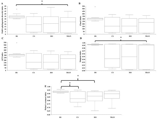 Species richness (A), species diversity (B–D), and species evenness (E) of 18S rDNA communities in four sites. BS = bare sand; CS = Cymodocea serrulata; HO = Halophila ovalis; TRAN = transplanted seagrass patch. Whiskers indicate the 10th and 90th percentiles. * = p < 0.05.