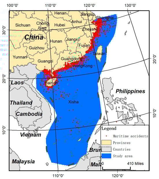 The study area (3–31° N, 106–127° E, with an area of ∼9.4 × 104 km2) is located on the coast of China, including most of the East China Sea and South China Sea (Figure 1). It borders Zhejiang, Fujian, Guangdong, Guangxi, and Hainan provinces. This area is an important sea passage between the Northwest Pacific and Uttara Patha Ocean. In addition, the area is also faced with a high maritime accident risk.