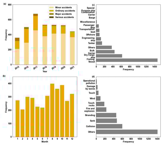 The frequency of accidents for (a) each severity level, (b) each month, (c) each ship type, and (d) each accident type, between 2015 and 2021.