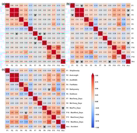 The Pearson correlation coefficient matrix of the influencing factors in (a) MMAP, (b) YMAP, and (c) M-YMAP models. Each square corresponds to the correlation between two factors. × indicates that the correlation coefficient is “not significant” (p-value < 0.05).