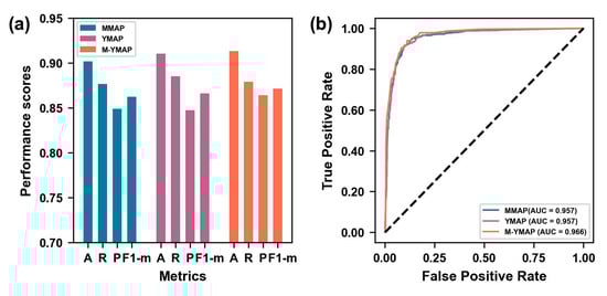 Evaluating the model performance is a necessary step. From Figure 5, we can see that all three models performed well (AUCs > 0.9). The AUC value is the largest for the M-YAMP, which is 0.966. The MMAP and YMAP have the same AUC value, which is 0.957. The values of the accuracy, precision, recall, and F1-measure are also similar in the three models. The numbers are 0.906, 0.877, 0.849, and 0.862 in the MMAP model, 0.910, 0.885, 0.847, and 0.866 in the YMAP model, and 0.913, 0.879, 0.864, and 0.871 in the M-YMAP model, respectively. Additionally, Figure 5b shows the ROC curves for the three models on the testing dataset, which all performed well. The model performances show that these three models have high predictive capacities.