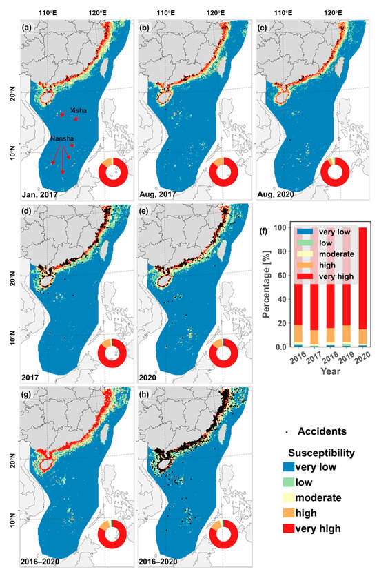 Maritime susceptibility maps and observed accidents: (a–c) January 2017, August 2017, and August 2020 susceptibility maps generated using MMAP model and associated observed accidents; (d,e) 2017 and 2020 susceptibility maps generated using YMAP model and associated observed accidents; (f) the percentage of observed accidents at different susceptibility levels from 2015 to 2020; (g,h) 2016–2020 maritime susceptibility maps generated using the M-YMAP model and associated observed accidents. The rings show the percentages of accidents at different susceptibility levels.