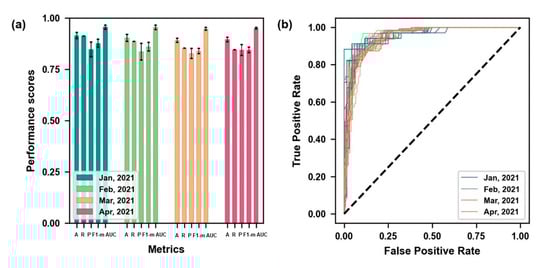 We tested the robustness of the established MMAP model by performing a blind test using January–April 2021 maritime accidents, which were not used in the training process. We chose the accident point and randomly chose a 2-fold non-accident point for performing the testing, and we repeated this process ten times. The performance results are shown in Figure 7. The mean values of the AUC for four months are 0.956, 0.955, 0.947, and 0.951, respectively, and the mean values of the accuracy, recall, precision, and F1- measure exceed 0.8. From Figure 8, we can see that the susceptibility maps also show relatively good results. In January 2021, most accidents fell into the H-class, with a percentage of 85.23%, which were 81.78%, 79.41%, and 79.41% for February, March, and April 2021. From January to April 2021, most accidents matched well with the predicted high-susceptibility areas. From the blind test of the MMAP model, we can see that the model has reasonably good results when applied to future maritime accidents.