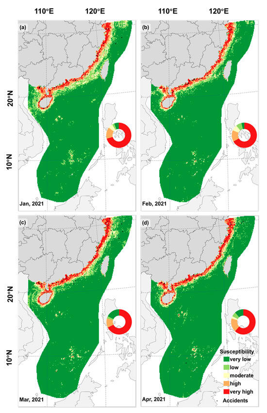 Maritime susceptibility maps developed using the MMAP model and observed accidents for (a) January 2021, (b) February 2021, (c) March 2021, and (d) April 2021.