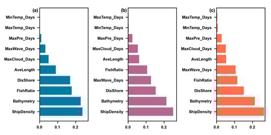 Figure 9 shows the relative importance of each accident-influencing factor in the three models. The conditioning factors in the three models had similar sorting. The ShipDensity was the most critical factor in the three models. The percentage was around 25% of the total information contribution, accounting for 23.91%, 25.10%, and 26.47% in the MMAP, YMAP, and M-YMAP models. Bathymetry was the second-highest factor in the three models, exceeding 20% of the total information contribution. Stranding accidents usually occurred in the low-water-depth areas. In addition, the DisShore was the triggering factor of the touch-rock accidents. It was ranked fourth, third, and third in the MMAP, YMAP, and M-YMAP models. Furthermore, the MaxWave_Days was the most critical factor among the dynamic weather features, which shows that the influence of waves and wind (the wind factors have strong positive correlations with waves) on the occurrence of accidents cannot be ignored. Temperature and precipitation had relatively less importance in the models among the influencing factors.