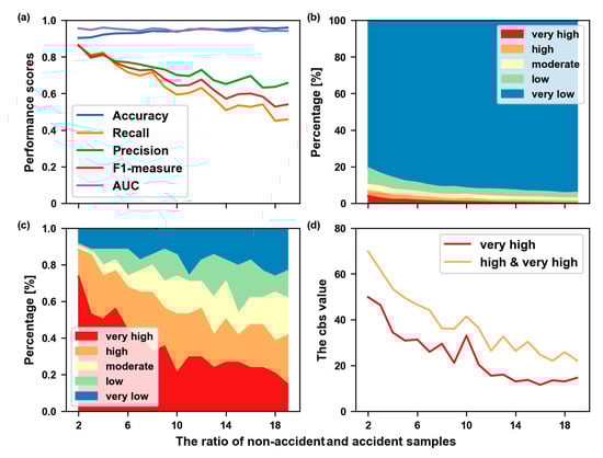 This study set the ratio of accident and non-accident samples to be 1:2 to avoid overfitting via the high sample imbalance based on most studies [,]. Under this setting, we obtained MMAP, YMAP, and M-YMAP models with excellent performances and predictive capacities. Taking the MMAP model as an example, the percentages of observed accidents falling in the H-class were 88.24%, 81.78%, 79.41%, and 79.41% for January 2021, February 2021, March 2021, and April 2021 (Figure 8). However, the accompanying problem is that the area judged as H-class is relatively large in the future prediction (Figure 8), accounting for 7.67% of the study area in January 2021, which means that we need to search a large-area grid to find one accident grid. In the following, we analyze the changing of the predictive capacity and sensitivity classification by adjusting the ratio of accidents and non-accidents in the MMAP model. In addition, we defined the cost–benefit ratio (cbr) to measure how many grids need to be checked to detect an accident grid, which is similar to the inverse-recall metric. The equation is shown as follows: