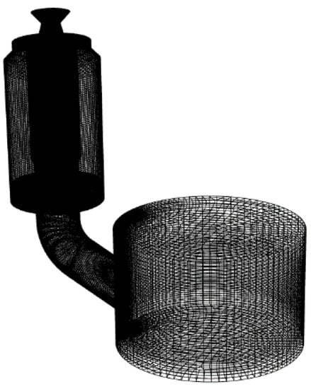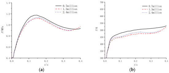 A structured mesh has better numerical ability than unstructured grids using multi-blocks. Also, a structured mesh can improve the fidelity of the flow solutions and assure a better resolution of shock waves in the flow field; so, a structured mesh type is used in the calculation model. The computational mesh for this study is shown in Figure 3. Based on the gas–steam ejection calculation model, grid models are established with three grid densities of 0.7 million, 1.3 million, and 2.4 million, respectively. Figure 4 show the results of average pressure and average temperature inside the launcher under three grid densities. When the grid is sparse, the calculated pressure and temperature values have a significant deviation compared to the other two dense grid conditions. However, the pressure and temperature values calculated for the grid conditions of 1.3 million and 2.4 million are consistent, basically satisfying the calculation accuracy requirements. However, the calculation time of the 2.4 million grid model is particularly long. Therefore, considering both calculation accuracy and efficiency, the initial number of grids for all calculation models of gas–steam ejection is controlled at 1.3 million. The time steps used in the model are 4 × 10−5 s. The total gas temperature is 3000 K, and the total pressure is 7,000,000 Pa at the nozzle inlet.