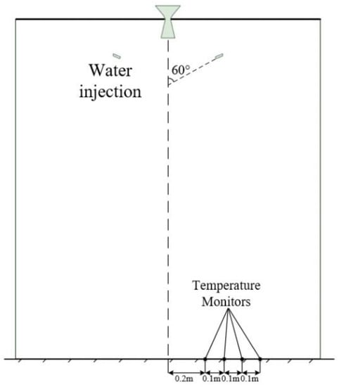 To verify the validity of the multiphase vaporization model [39] for the high-temperature jet and liquid water vaporization models, we simulate the water injection problem in solid rocket motors. The experimental setup is shown in Figure 5. The angle between the spray pipe and the axis of symmetry is 60°. Four temperature-monitoring points are distributed on the bottom plate, with distances from the axis of symmetry of 0.2 m, 0.3 m, 0.4 m, and 0.5 m, respectively. The nozzle wall, water pipe wall, and bottom plates are all set as solid walls. The outlet boundary of the plume is set to a pressure of 101,325 Pa, and temperature of 300 K. The experimental result with water injection and temperature contour is shown in Figure 6. The measured and simulated temperatures at the four monitoring locations are compared in Table 2.