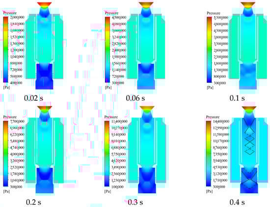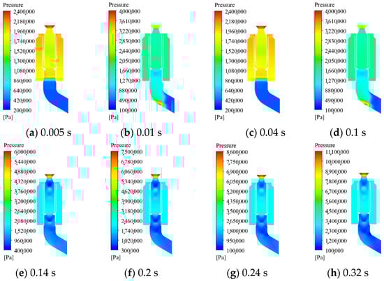 The flow field distribution of the gas–steam ejection device with a spray hole diameter of 4 mm, a number of 500 spray holes, and a secondary nozzle throat diameter of 120 mm at different times for case 3 is analyzed. The pressure distributions of case 3 in the symmetric plane of the device at different times are shown in Figure 7 and Figure 8. Significant pressure fluctuations are noticed in the primary and secondary diversion pipes, as well as inside the bent pipeline. The pressure inside the first stage guide tube is mainly transmitted by a positive shock wave in the early stage due to the small inlet pressure of the primary nozzle and restrictions on the rear, resulting in a sharp increase in pressure after the shock wave. When water vaporizes and enters the bend and launcher, it is gradually affected by the increasing pressure at the inlet of the nozzle and the increasing pressure ratio. Therefore, the fluid in the first stage guide tube undergoes overexpansion, and the airflow pressure at the outlet of the nozzle shows repeated fluctuations. There are water jets at the position of the second stage guide pipe, which limits the further outward expansion of the airflow. The pressure fluctuation at this position is mainly caused by the continuous action of the water jet. At the position of the bend, the airflow and the wall interact and restrict each other, resulting in the intersection and reflection of shock waves and expansion waves. As the pressure inside the launch tube fluctuates, there will be repeated pressure fluctuations inside it. The fluctuation of pressure is mainly caused by the shock and expansion waves of supersonic airflow [40]. However, due to the use of the total pressure curve generated by turbocharged combustion at the inlet of the primary nozzle, the overall pressure value continues to increase over time, and the pressure acting on the entire launch device also gradually increases.