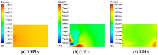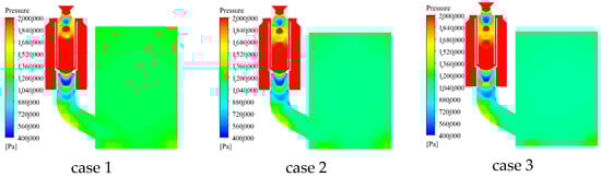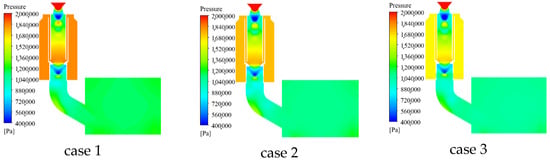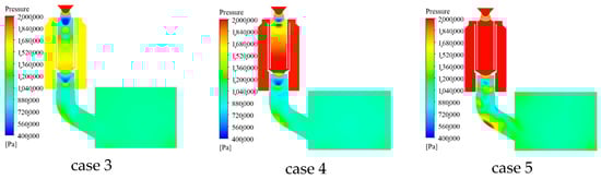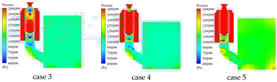 - The pressure distributions at two different times under three different throat diameters of the secondary nozzle are shown in Figure 39 and Figure 40. From Figure 39 and Figure 40, it can be seen that the pressure variation pattern within the entire device is basically consistent under three cases, and a significant water spray pressure difference is generated near the water spray hole. As the throat diameter decreases, the gas is limited when it reaches the secondary nozzle, and the pressure in the water chamber within the gas action area increases. Therefore, in case 5, where the throat diameter is the smallest, the spray pressure difference value inside and outside the spray hole is the largest.