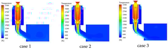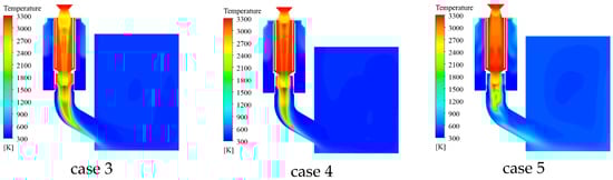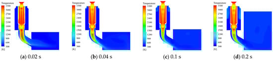The temperature distributions at different times of case 3 are shown in Figure 9. From Figure 9, it can be seen that the temperature values of the jet in the core area of the guide tube are relatively high, all above 2000 K. After the gas reaches the water chamber position, it comes into contact with the water surface to cool down. Under the pressure difference, water flows out of the spray hole and vaporizes with the main flow boundary of the gas, playing a role in evaporative cooling.
