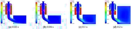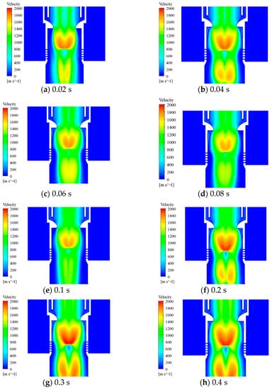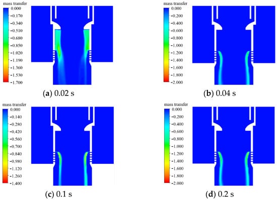 The velocity cloud diagram near the spiracle of case 3 is shown in Figure 12, and the distribution cloud diagram of two-phase mass transformation near the spiracle for case 3 is shown in Figure 13. When the water flow rate increases to 0.04 s, the gas at the corresponding position of the spiracle is squeezed, and the jet boundary range gradually approaches the center. As the inlet pressure increases, the range of gas flow quickly expands within 0.1 s, and approaches the wall surface of the spray pipe after 0.4 s. Under the action of the water jet, the gas jet is gradually compressed first, and then expands outward.