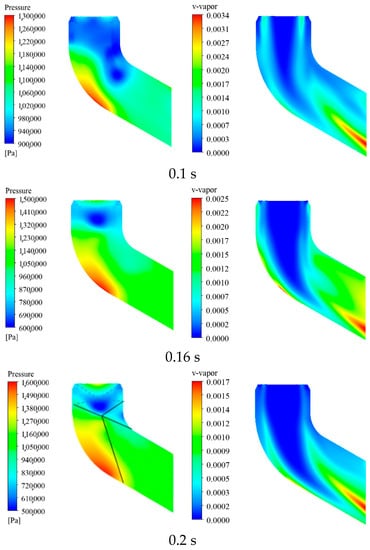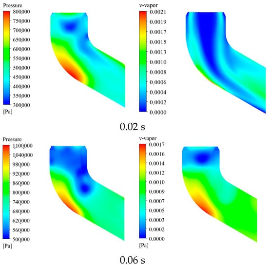 The distribution of pressure and steam phase volume fraction in the curved pipe for case 3 is shown in Figure 14. The gas flowing out of the spray pipe has a high pressure, and when it enters a larger area in the bend, an expansion wave system is generated, resulting in a decrease in pressure. After the gas flow interacts with the upper bend walls, two compression waves are generated, causing the pressure to increase. After the compression wave intersects, the compression wave system is reflected, acting on the lower end of the bend and the inner side of the bend. Due to the short distance of the elbow, under the influence of the confined space of the launcher, the outlet of the elbow is compressed by the pressure in the canister. From the water vapor distribution diagrams in the right column, it can be seen that the distribution of gas flow wave system in the bend has the same effect as the two-phase transformation. Most of the steam is generated between the boundary of the gas jet and the wall, and the generated steam increases the local pressure and thus the gas flow is confined.