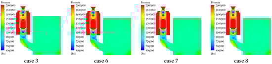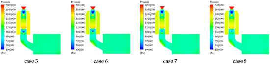 Pressure contours of cases 3, 6, 7, and 8 at 0.2 s.