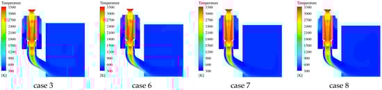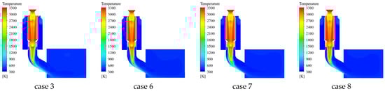 Temperature contours of cases 3, 6, 7, and 8 at 0.2 s.