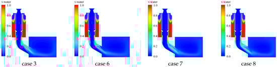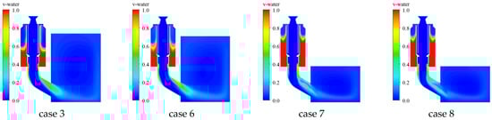 Figure 19. Water volume fraction contours of cases 3, 6, 7, and 8 at 0.1 s.