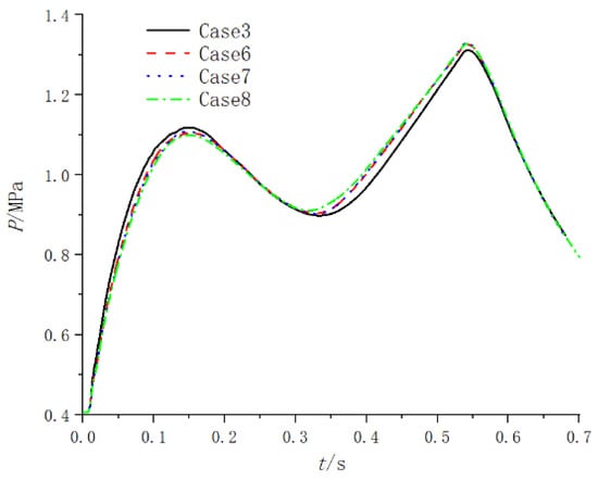 Pressure contours of cases 3, 6, 7, and 8 at 0.1 s.