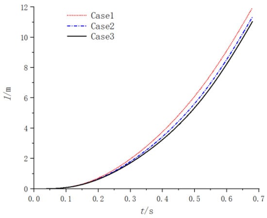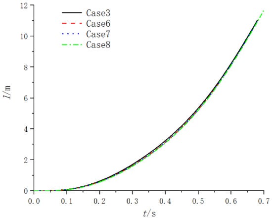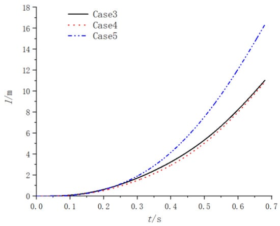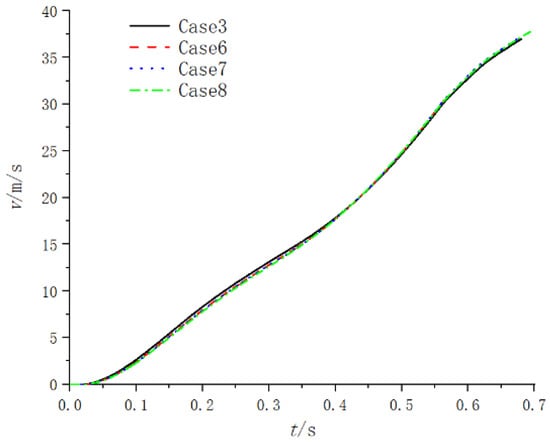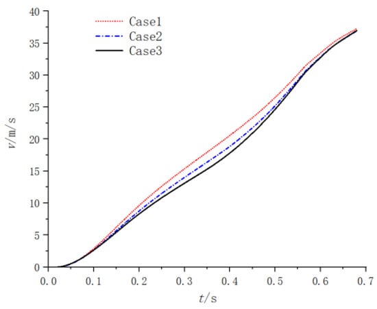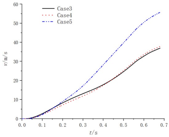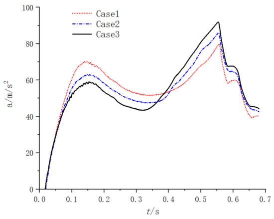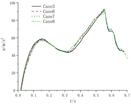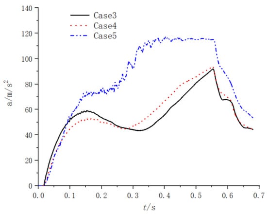 The acceleration, velocity, and displacement curves of the projectile motion under different total spray areas are shown in Figure 36, Figure 37 and Figure 38, and the corresponding acceleration in case 1 appears linear.