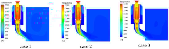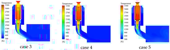 The temperature distributions under different spray hole diameters is shown in Figure 17 and Figure 18. The temperature of the gas flow in the guide pipe is relatively high, above 2000 K. After the gas reaches the water chamber, it comes into contact with the water surface and cools down. Under the gas pressure, water flows out of the spray hole and vaporizes at the boundary of the main gas jet.