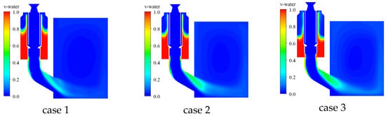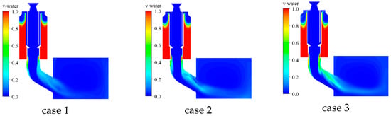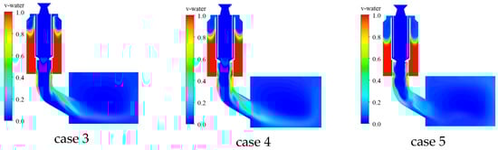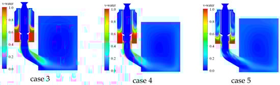 - The contours of water volume fraction of three different secondary nozzle throat diameters at two different time points are shown in Figure 43 and Figure 44. It can be seen from Figure 43 and Figure 44 that the increase in spray pressure directly leads to an increase in spray flow rate, and therefore the water consumption in the water chamber of case 5 is the fastest.