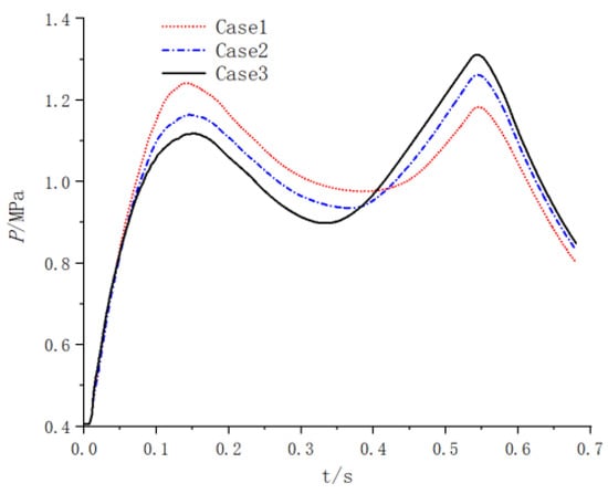 The pressure distribution under different spray hole diameters is shown in Figure 15 and Figure 16. In general, the pressure variations within the entire launch cylinder are very similar, except the weak dependences of local pressure on the spray hole size. When the diameter of the spray hole is small, the pressure value near the spray hole is smaller.