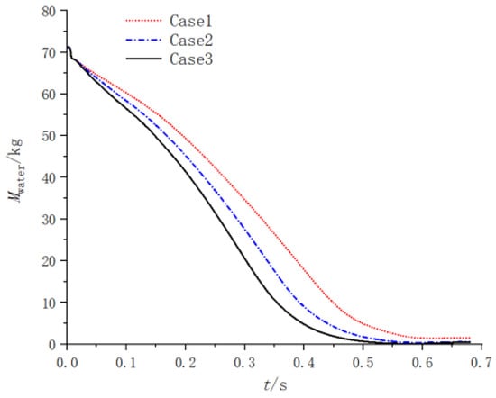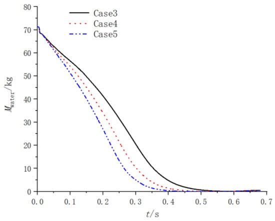 - The changes in the total water mass in the launcher under different spray hole diameters are shown in Figure 23. In the early stages of the launch process, the larger diameter of the spray hole corresponds to a faster decrease in water flow quality, resulting in a lower temperature.