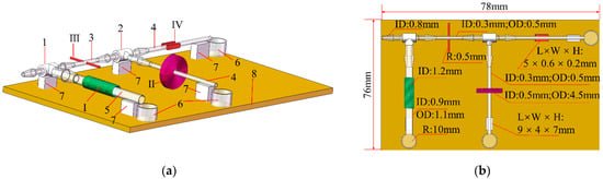 Figure 1 depicts the overall configuration of the sensor. The components of the sensor mainly include: three-way tubes (1 and 2), capillary glass tubes (3, 4 and 5), oil reservoir (6), PMMA (7), slide (8), detection units of inductive mode (I and II), and detection units of capacitive mode (III and IV). The specific dimensions of each component are shown in Figure 1b. The structural parameters of the detection unit for different detection modes are shown in Table 2.