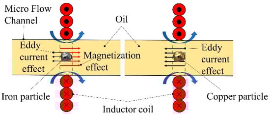 Figure 2 illustrates the principle of inductive mode detection. When AC voltage is applied to the detection units, if ferromagnetic particles in the fluid pass by, the magnetic effect of magnetization causes the apparent inductance of the detection unit to increase, which is greater than the effect of eddy currents. On the other hand, if non-ferromagnetic particles pass by, the apparent inductance of the detection unit only decreases due to the effect of eddy currents.