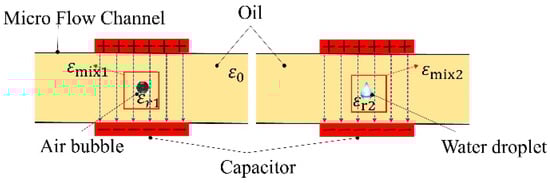 In the case of the capacitor structure parameters being determined, the change in capacitance depends entirely on the change in the dielectric constant of the medium. When the dielectric constant of the oil and particle mixture is greater than that of the oil , the change of capacitance is positive, and the reverse is negative. It is possible to differentiate between the detection of water droplets and air bubbles in the oil based on the direction in which the capacitance changes.
